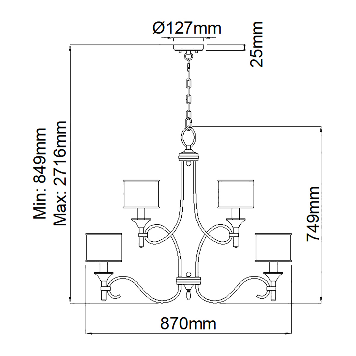 5 ламп - мин. длина - 75.6 см, макс. длина - 262.3 см. (Д63.5 х В65.6 см) Вес - 7.92 кг