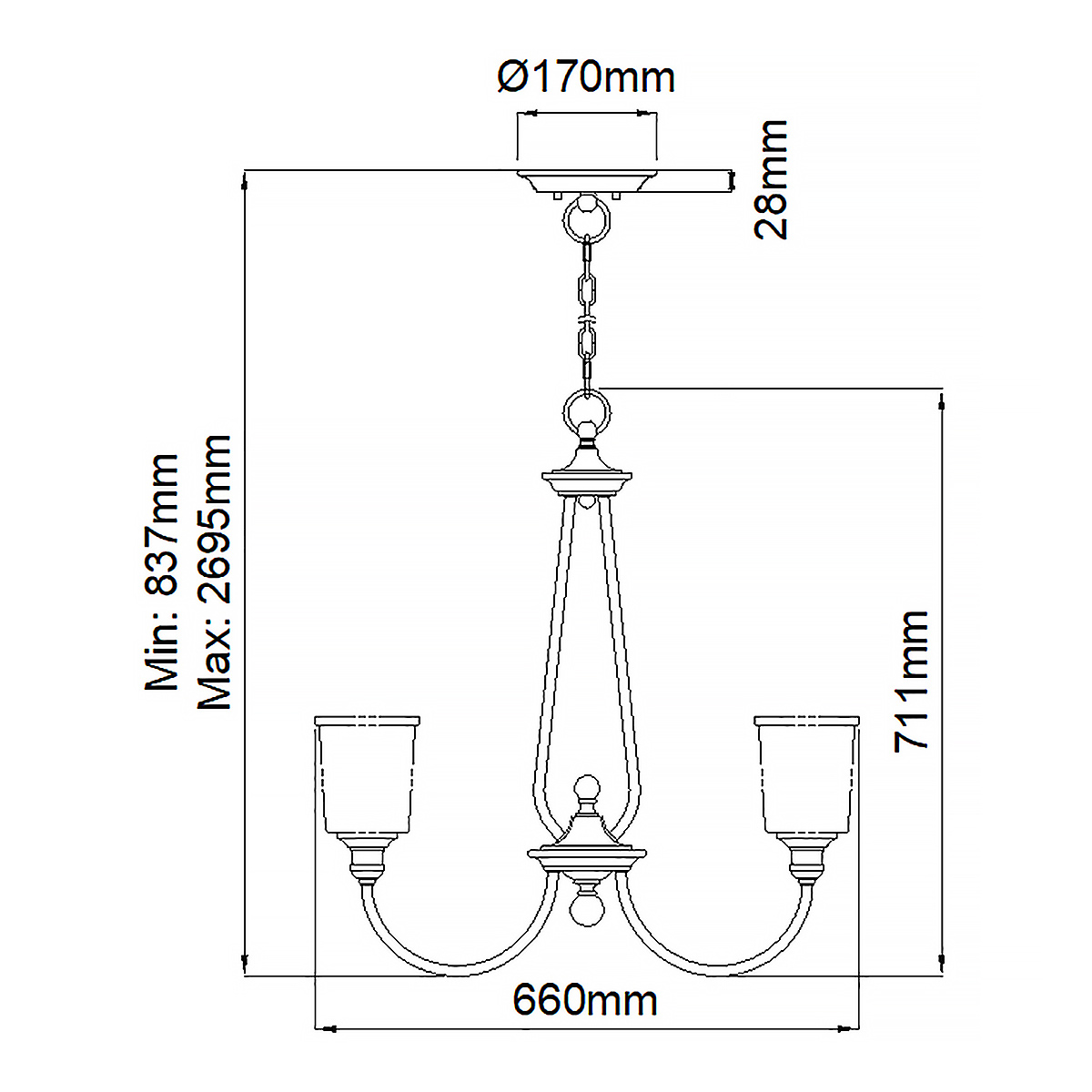 5 ламп - мин. длина - 83.7 см, макс. длина - 269.5 см. (Д66 х В71.1 см) Вес 5.63 кг