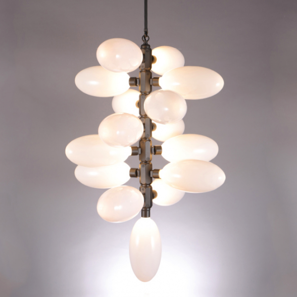 Каждая люстра состоит из большого количества плафонов нанизанных на алюминиевые подвижные позвонки. Что дает возможность видоизменять люстру, давать ей естественное ниспадание. Каждый плафон выдувается вручную - что дает особенное, в полном смысле этого слова, неповторимое, изящество.