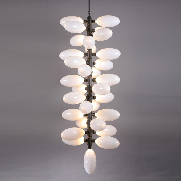 Каждая люстра состоит из большого количества плафонов нанизанных на алюминиевые подвижные позвонки. Что дает возможность видоизменять люстру, давать ей естественное ниспадание. Каждый плафон выдувается вручную - что дает особенное, в полном смысле этого слова, неповторимое,  изящество.