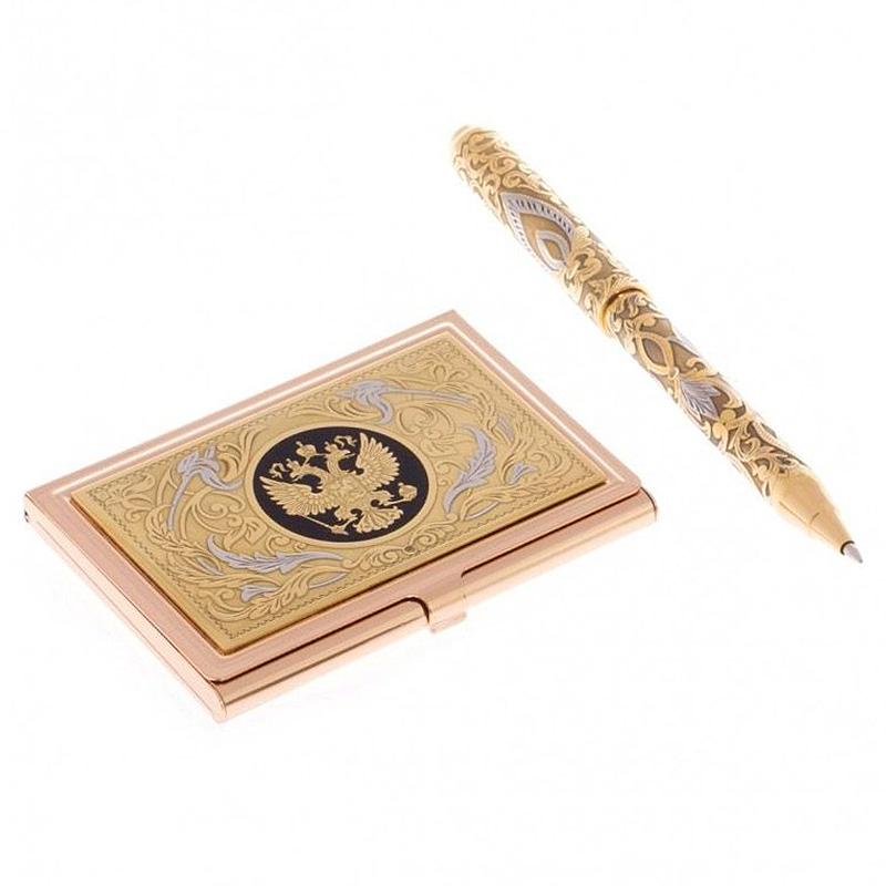 Набор из ручки шариковой металлической и карманной визитницы с гравировкой Герба России Metal Pens Никель Золотой Черный в Костроме | Loft Concept